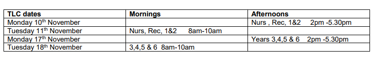 Week beg: 10-11-25 Reception, 1 & 2 Termly Learning conferences. (TLCs) Week Beg: 17-11-25 Years 3– 6 TLCs. Information will be sent to you.