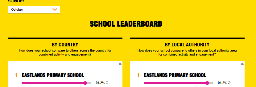 Congratulations to Year 2 for being top across school at the end of October! 98% of 540 total possible trips recorded, 99% of them were active. As a school, we finished 1st in the Country and 1st in our Local Authority! Well done to everyone!