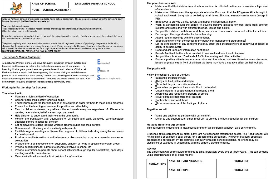 As part of our commitment to providing your child with a nurturing and effective educational environment, we invite you to read and acknowledge our Home School Agreement. This agreement outlines the responsibilities of the school, the parents, and the children. It is designed to ensure that we all work together to support your child's learning and development. We believe that a strong partnership between home and school is key to enabling children to achieve their best. Thank you for your cooperation and commitment. The agreement can be viewed by clicking the link below.