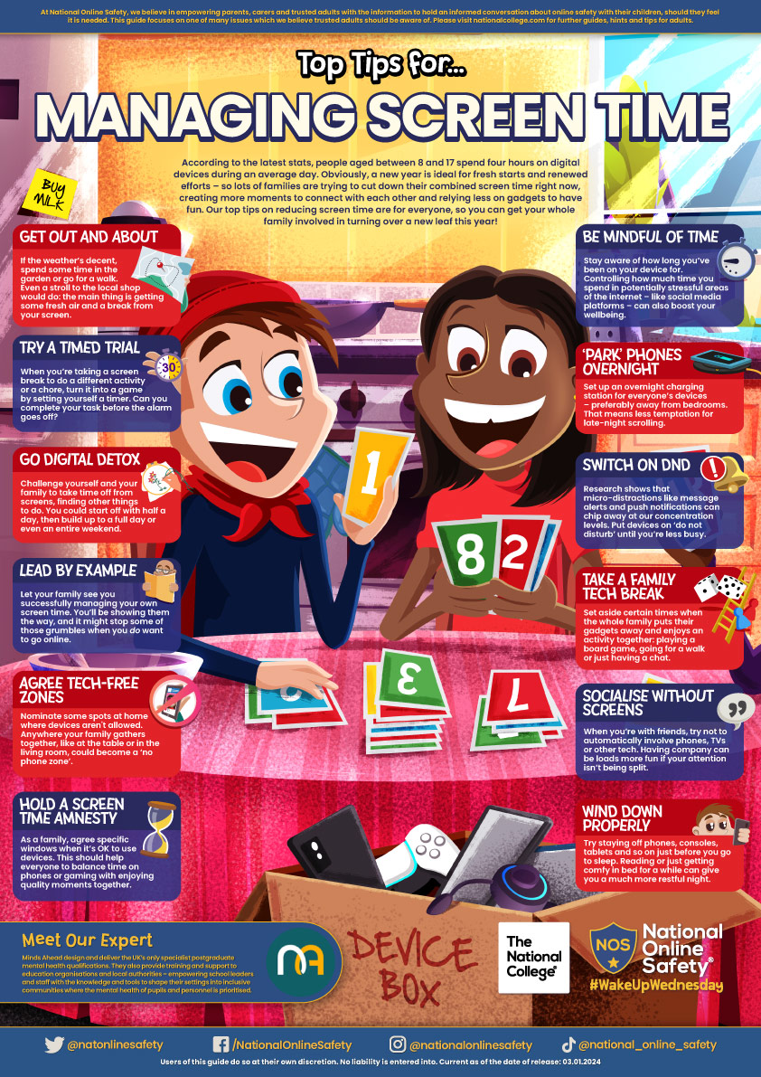 8th February With Safer Internet Day coming up, we are sharing Wake Up Wednesday Guides for each Year group. An online safety guide provides some practical tips for helping to reduce your family’s screen time and promote healthier use of devices.