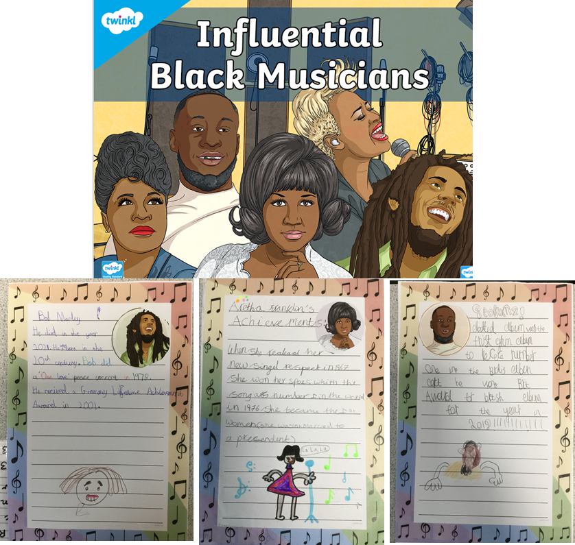 Year 3 have been doing some research on Black History musicians as part of our Black History Month activities. They learnt about Aretha Franklin, Ella Fitzgerald , Stormzy, Bob Marley and Emeli Sandé. The children produced some lovely writing on their particular musician that they chose and were inspired by their journey to fame.